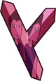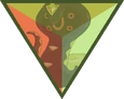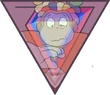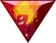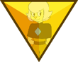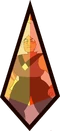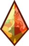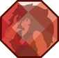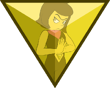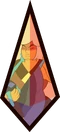 Green Sapphire's gemstone is located in the palm of her right hand, featuring a triangular facet. The front and back are symmetrical. It is an octahedron, specifically a truncated trigonal dipyramid.