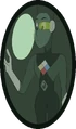 She wears a green dress with dark green accents, a Yellow Diamond insignia on her chest, white shoulder pads, and matching gloves.
